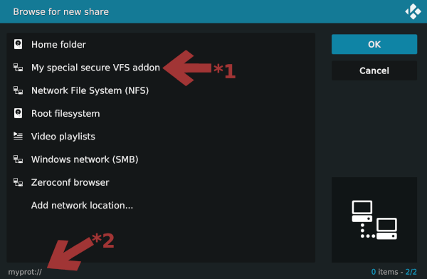 *1: The entry in the menu represented by this option corresponds to the text given with label. When the button is pressed, CInstanceVFS::GetDirectory is called on the add-on to get its content.*2: Protocol name of the stream defined with protocols in xml.