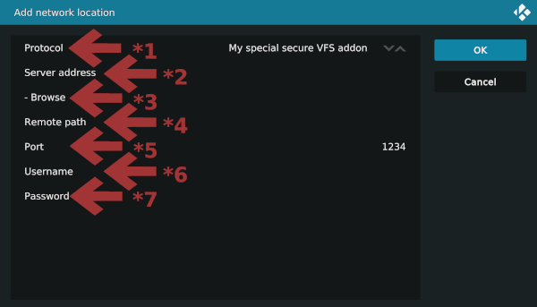 *1: Field for selecting the VFS handler, the addon will be available if supportDialog is set to true.*2: To set the associated server address. Note: This field is always activated and cannot be changed by the addon. *3: If supportBrowsing is set to true, the button for opening a file selection dialog is given here too, as in the file window.*4: This field is available if supportPath is set to true.*5: To edit the connection port. This field is available if supportPort is set to true.*6: This sets the required username and is available when supportUsername is set to true.*7: This sets the required password and is available when supportPassword is set to true. | ||